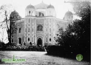 Kanhaiya Lal, in his book Tarikh-e-Lahore attributes the tomb to Jani Khan, titled Intizam-ud-Daula, son of Nawab Qamar-ud-Din Khan, and elder brother of Moin-ul-Mulk, titled Mir Mannu. According to his account, Qamar-ud-Din Khan, minister of Emperor Muhammed Shah died while fighting Ahmed Shah Durrani in 1748. Following which, Jani Khan, along with his brother Moin-ul-Mulk launched a fierce attack and forced Ahmed Shah Durrani to return back to Kabul. Moin-ul-Mulk then became the governor of Punjab and appointed Jani Khan as Commander of the army. Jani Khan died in 1778 and was buried here. Latif gives a similar account of the occupant of the tomb but refers to him as Khan-i-Khanan, surnamed Yamin-ud-Daula. Latif also writes that Khan-i-Khanan came to Lahore to settle a dispute between his sister and Nawab Zakariya Khan, to whom she was married, and fell ill and died in Lahore in 1778.